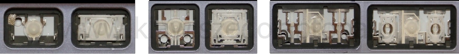 - Para escolher o modelo correto, compare a foto do espaço vazio no seu teclado com as fotos abaixo, ou remova a tecla “A” – por baixo dela há sempre um encaixe médio.