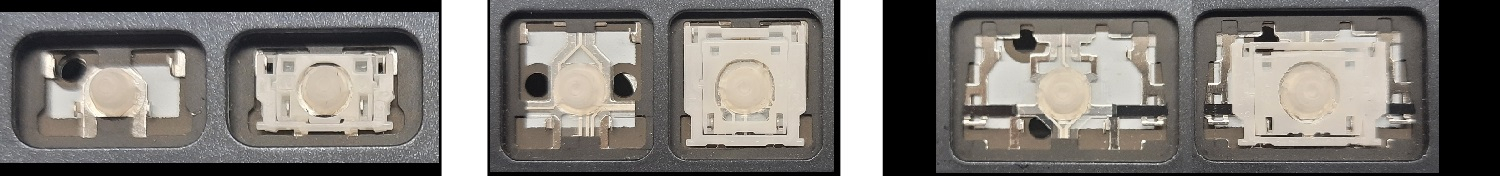 - Para escolher o modelo correto, compare a foto do espaço vazio no seu teclado com as fotos abaixo, ou remova a tecla “A” – por baixo dela há sempre um encaixe médio.