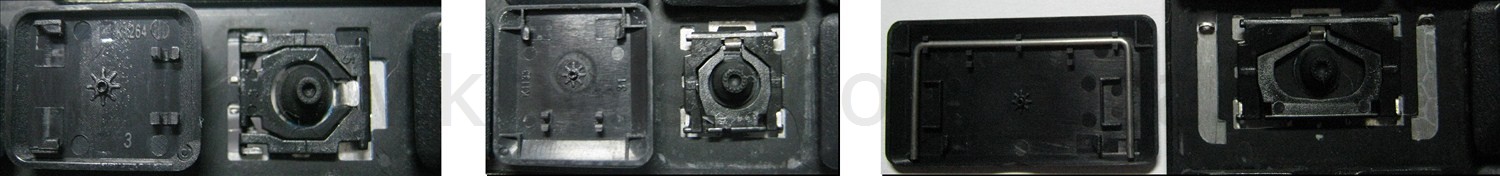 - Para escolher o modelo correto, compare a foto do espaço vazio no seu teclado com as fotos abaixo, ou remova a tecla “A” – por baixo dela há sempre um encaixe médio.