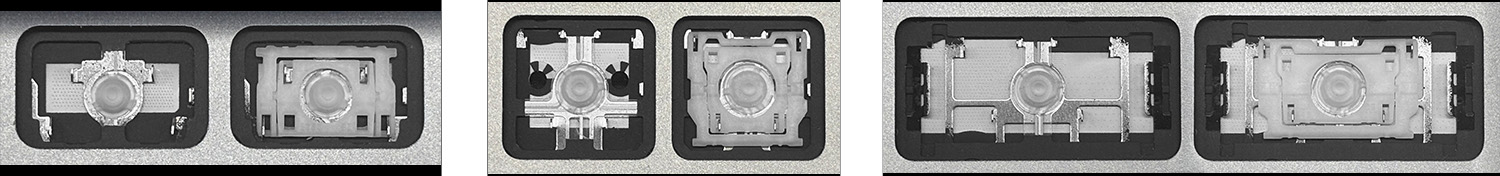 - Para escolher o modelo correto, compare a foto do espaço vazio no seu teclado com as fotos abaixo, ou remova a tecla “A” – por baixo dela há sempre um encaixe médio.