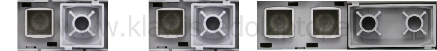 - Para escolher o modelo correto, compare a foto do espaço vazio no seu teclado com as fotos abaixo, ou remova a tecla “A” – por baixo dela há sempre um encaixe médio.