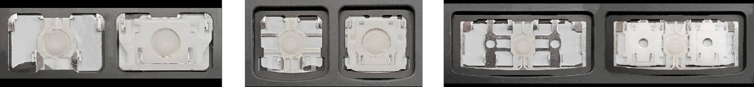 - Para escolher o modelo correto, compare a foto do espaço vazio no seu teclado com as fotos abaixo, ou remova a tecla “A” – por baixo dela há sempre um encaixe médio.