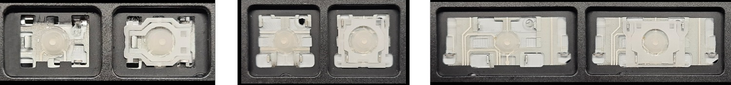 - Para escolher o modelo correto, compare a foto do espaço vazio no seu teclado com as fotos abaixo, ou remova a tecla “A” – por baixo dela há sempre um encaixe médio.